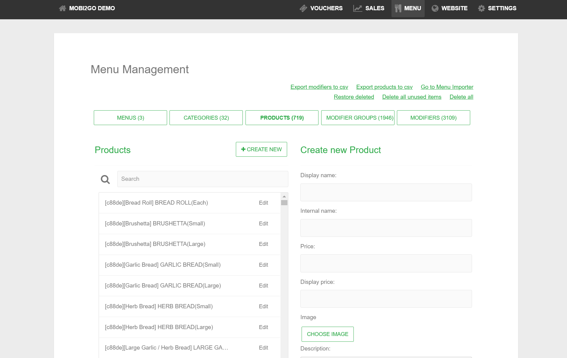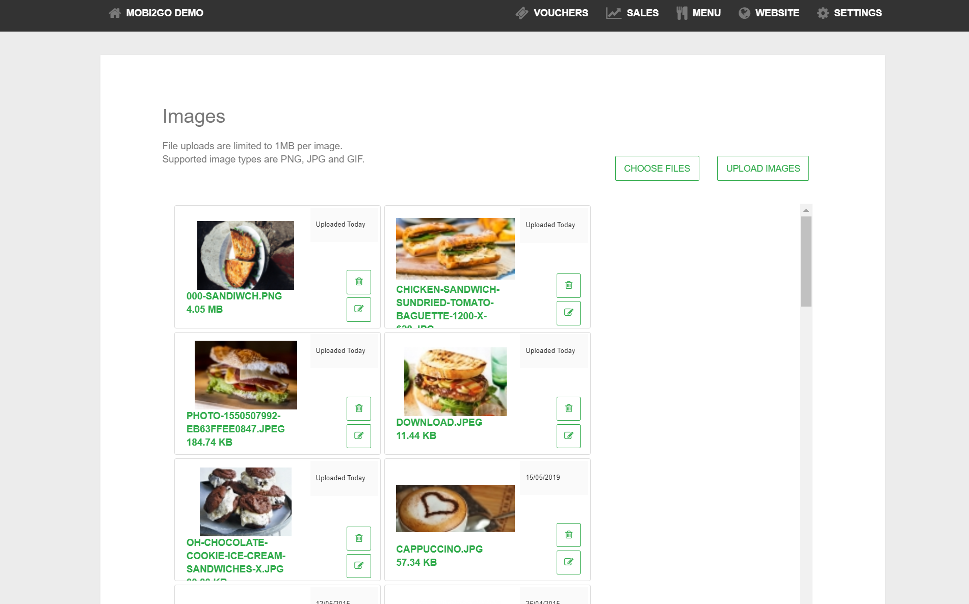 If you are planning to have images on your menu or website, this can be done in a 2-step process. First the product, menu or any website images are uploaded to Images, which is like a central repository. Once they are uploaded to Mobi2Go portal, you can go into the Menu Editor & select those images from the repository & add them to products or you can add them to your website design.