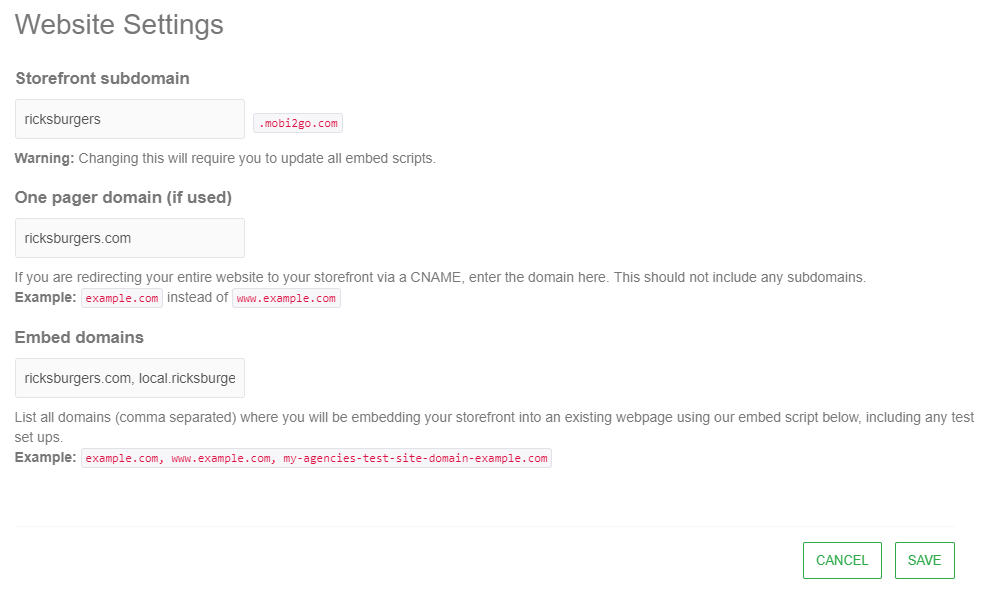 For example: If your storefront is embedded at https://ricksburgers.com/order-online, the domain ricksburgers.com will need to be added to the external domain list.