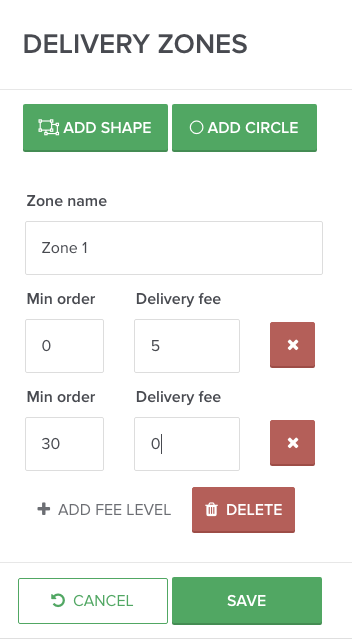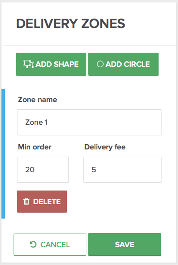 You can view your established zone on the right-hand column. From here assign your store zone's name, minimum order amount and delivery fee.