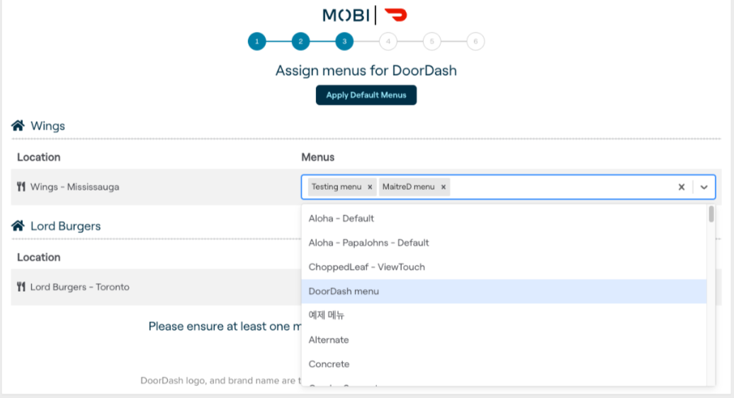 These are the menus that have been built in MOBI, for use with DoorDash. They are usually prefixed with [DoorDash] or [Aggregator]. If you are unsure which menu to use, please contact your MOBI representative or support@mobihq.com.