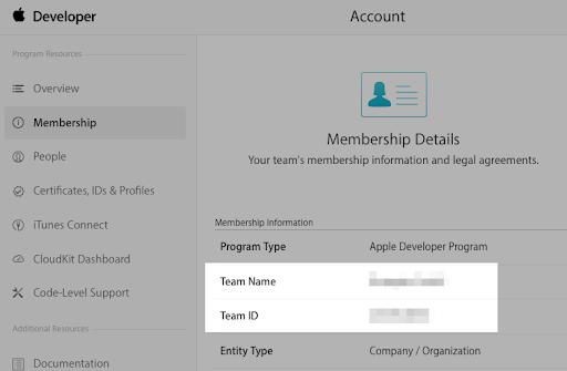 Please then email us with your Apple ID, Team Name, and Team ID. These can be found when logged into the Developer Account → Membership.