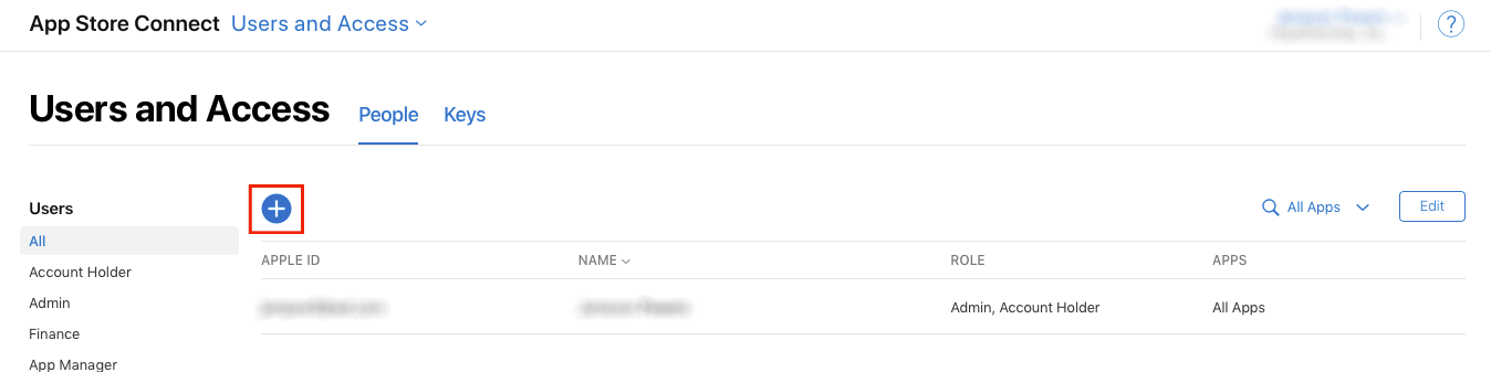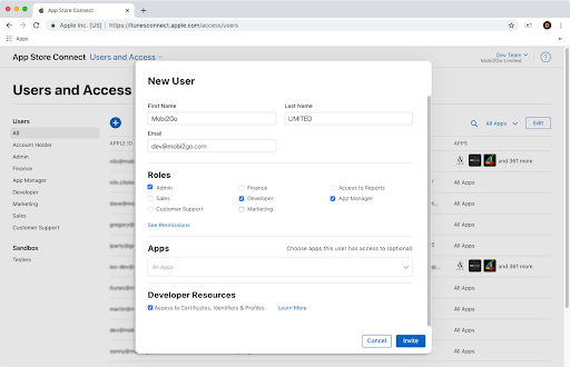 3. The Add App Store Connect user page will open. Enter the following User Information for Mobi2Go and click Next: