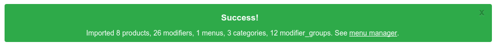 12. Once the menu has finished importing, a message will display providing a summary of what was imported & how many of those items were imported