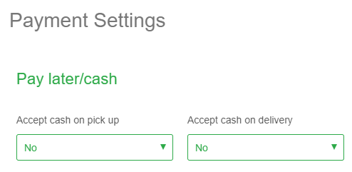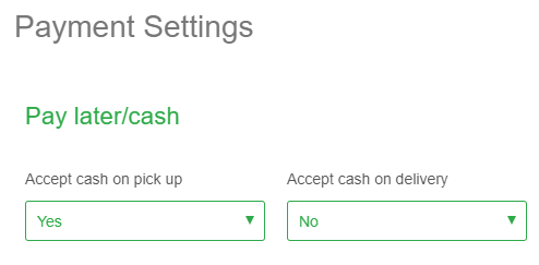 Under Payment Settings & Pay later/cash, if Accept cash on pick up is set to Yes, you're good to go. If not, click on the drop-down and change it to Yes.